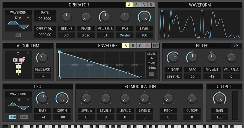 Exakt Lite is an intuitive and user friendly FM synthesizer plugin. From the harsh digital and cold sounds known from the FM era to warm and organic sounds, Exakt Lite can create a wide range of sounds. It has 4 operators which can be arranged in the classic 8 FM algorithms with feedback on operator D.
