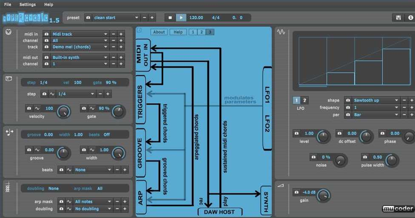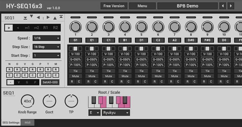HY-SEQ16 is a 16-step sequencer with note, velocity, gate, mute, randomize and probability controls for each step. Other cool features include global randomization for the entire sequence (with separate randomize buttons for note values, velocity, gate, etc.), sequence playback direction (forward, backward, bounce and random), sequence length and start step, as well as the global scale setting.