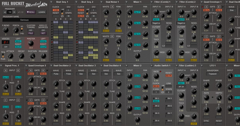 ModulAir is a fully modular virtual synthesizer featuring 31 different module types and supporting up to eighteen modules per patch and up to 64 voices of polyphony. The instrument also features double-precision audio processing, full MIDI learn support, and importing of TUN/SCL micro-tuning formats.