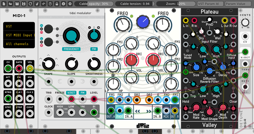 VeeSeeVSTRack is an adaption of VCV Rack for the VST2.4 format. VCV Rack is a free open-source virtual modular synthesizer, where multiple modules can be connected to synthesize a sound. The plugin contains several VCOs, LFOs, mixers, and other standard synthesizer modules, as well as many additional community modules.