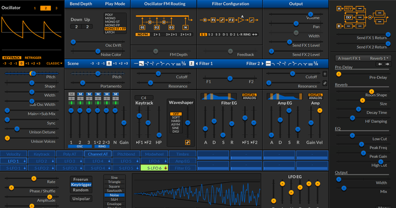 Surge is a hybrid subtractive synthesizer boasting a dual synth engine, three oscillators per voice with eight oscillator algorithms (analog, FM, wavetable, audio input, and more), 183 wavetables, two filter units with eight filter types, twelve highly customizable LFO modules per voice, eight FX slots with ten FX types to choose from, and a modulation matrix.